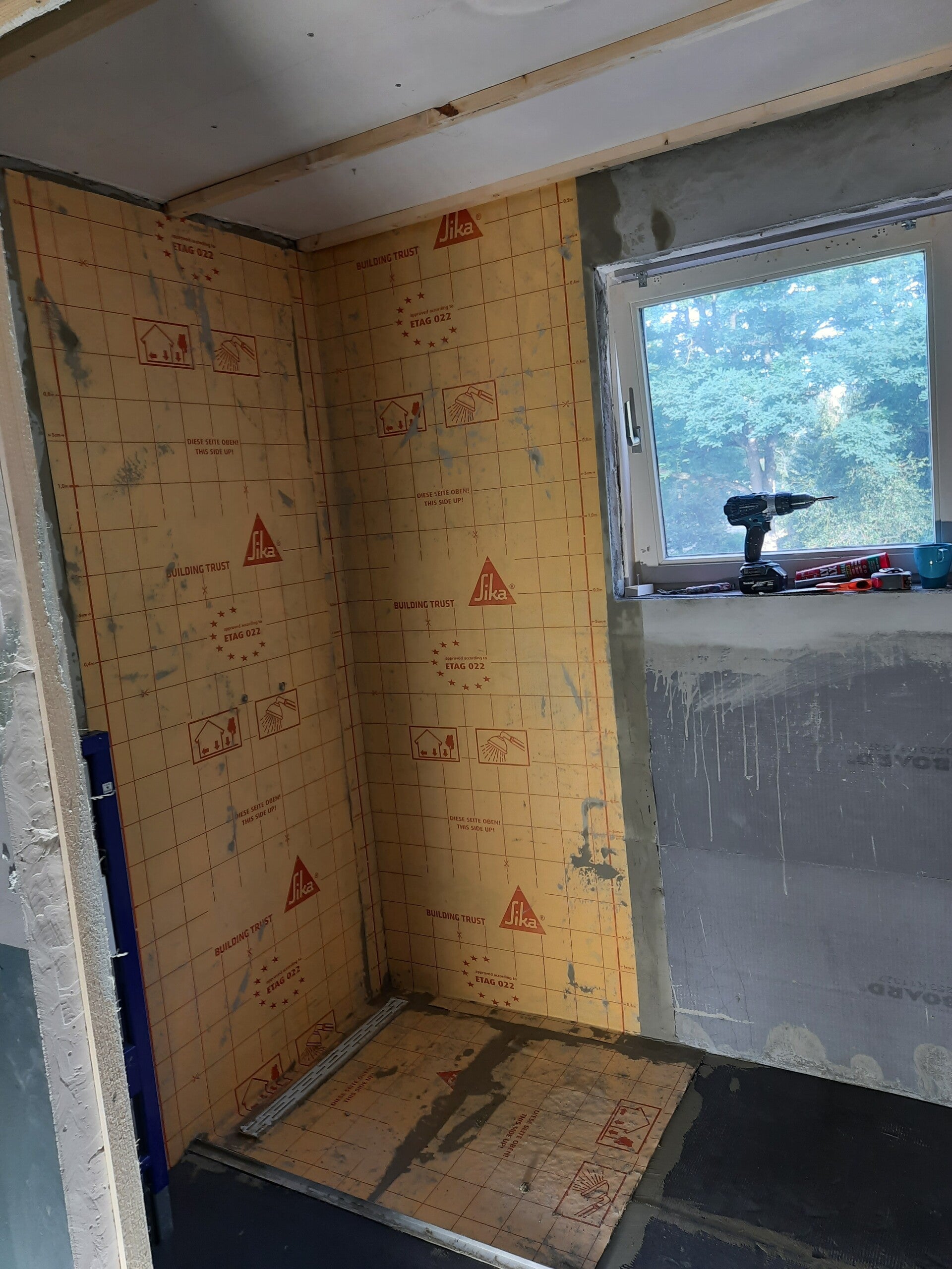 Wanden strak zetten, vloerverwarming er in en dan kunnen we gaan tegelen.